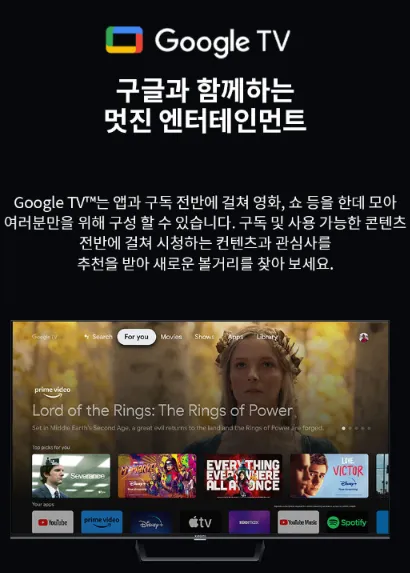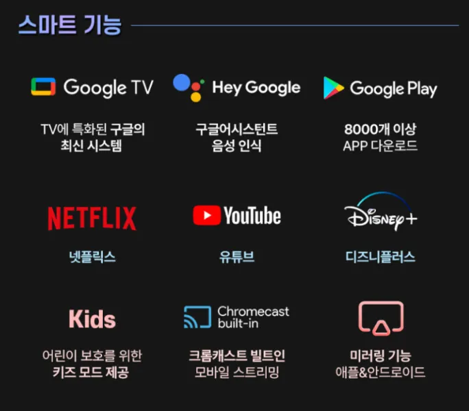 부가기능: 넷플릭스, 디즈니플러스, 구글 TV, 유튜브 등