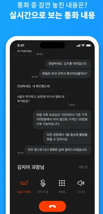 특히 텍스트 기록의 장점은 긴 시간 통화 시 녹음된 내용을 전부 들으면서 필요한 내용을 찾는 시간을 줄여주며, 필요한 부분의 말풍선을 선택하여 해당 부분의 오디오를 바로 들으실 수 있습니다. 음성만으로는 통화녹음 관리가 어려운데 문자로 저장됨으로써 검색 또는 태그를 이용하여 녹음내용을 데이터로 관리할 수 있게 된 것입니다.