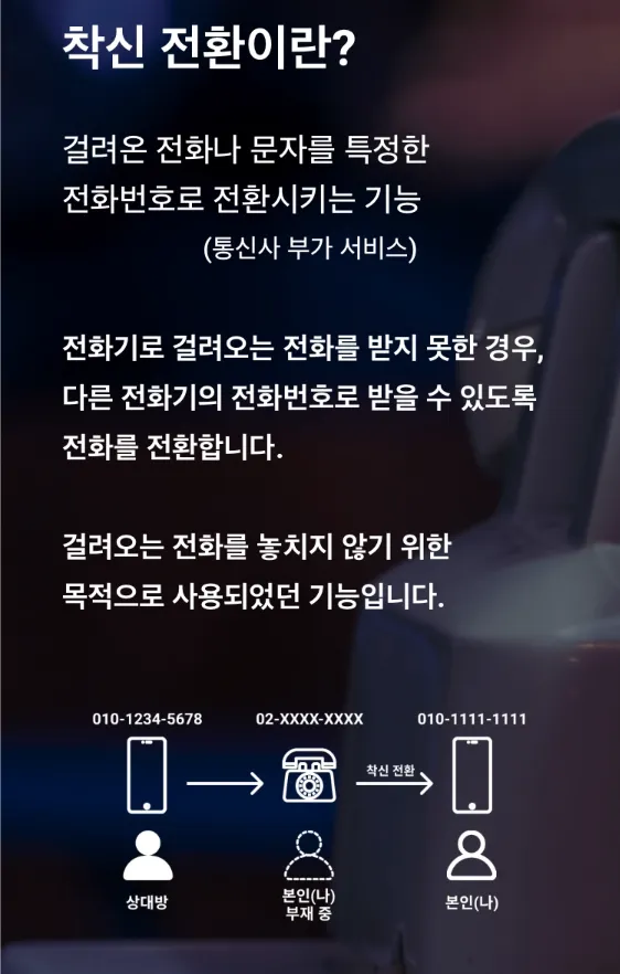 수신전화의 경우 어플을 이용해야만 통화 녹음이 되기 때문에 착신전환을 신청해야만 합니다. 착신전화 서비스는 어플을 이용하여 신청하는 것이 아니라 현재 사용하고 있는 각 통신사서비스로 월 천 원 미만의 비용이 사용됩니다.